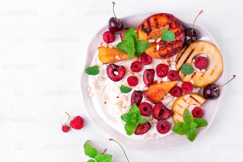 Персик и яблоко на гриле в творожном креме с малиной, вишней, мятой и кедровыми орешками. Подается летний десерт