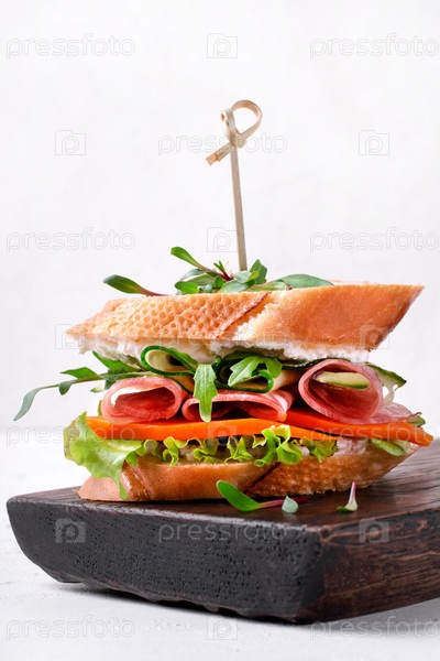 Сэндвич с копченой колбасой, сыром чеддер, овощами и микрозеленью на белом столе