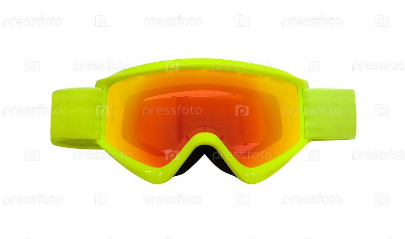 Вид сверху на желтые лыжные или мотокроссовые очки на белом фоне