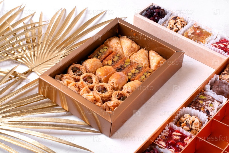 Коллекция восточных сладостей в золотой коробочке. Арабская пахлава, уш-эль-буль-буль и рахат-лукум на белом столе