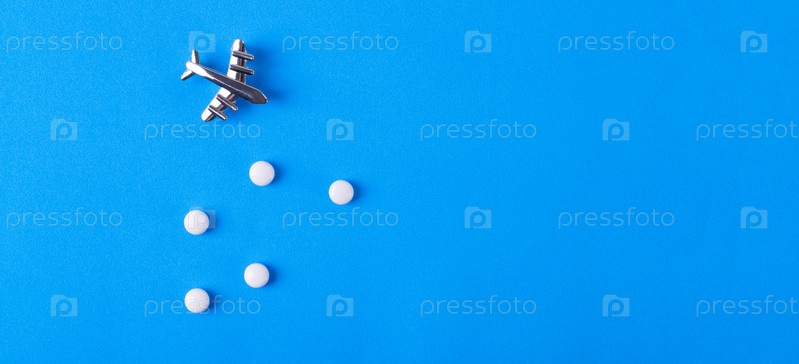 Маленький самолет и таблетки на синем фоне. Концепция укачивания и лекарств для полета. Плоская планировка с копией пространства