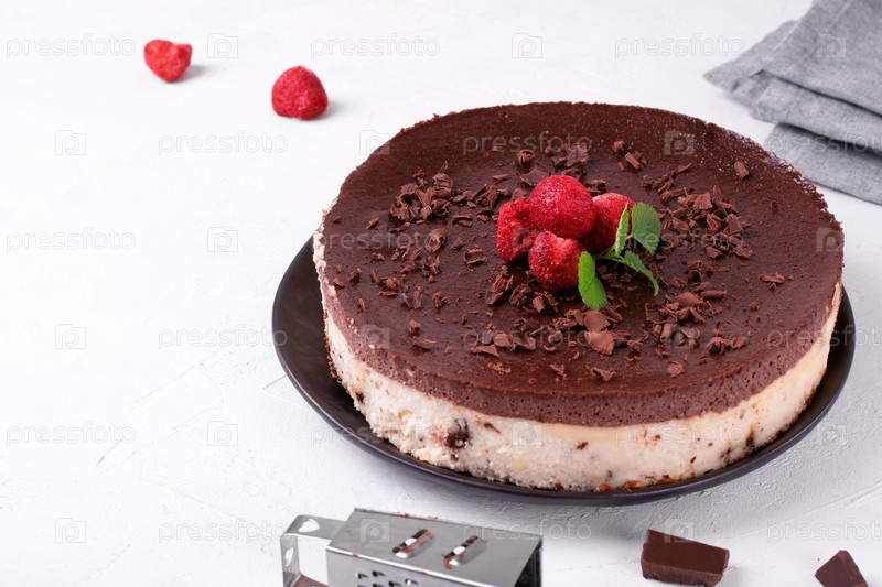 Двухслойный чизкейк с творогом и шоколадом, украшенный ягодами. Безглютеновый десерт на белом столе