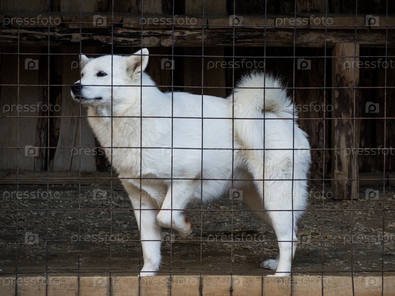 Белая хаски стоит в клетке
