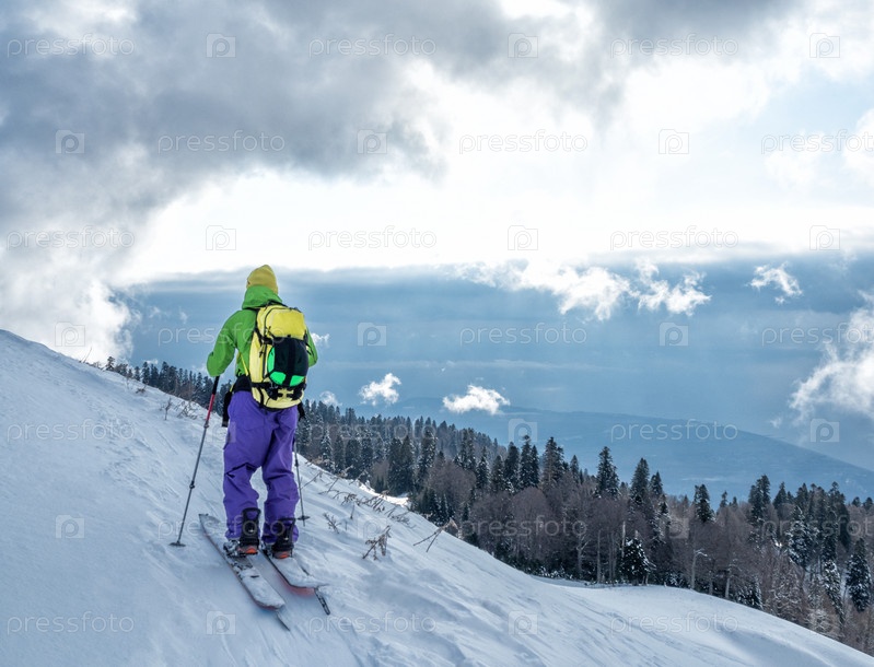 Спортивный человек катается на лыжах с палками на сплитборде и поднимается на горную вершину