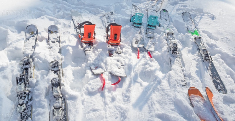 Сплитборды и лыжи на белом снегу. Спортивное снаряжение для скитура