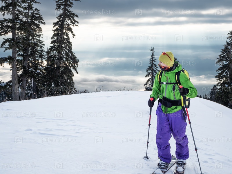 Вид спереди молодого активного спортсмена на лыжах или сплитборде на лыжах