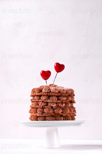 Шоколадный торт с кофейным кремом, украшенный двумя сердечками, подается на подставке для торта. Десерт ко дню святого Валентина. Копировать пространство