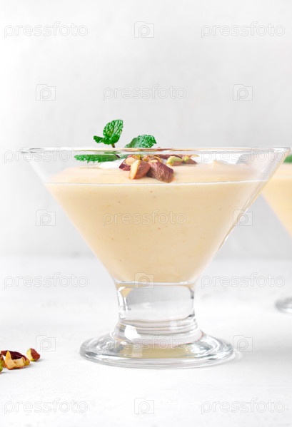 Десерт из манго с йогуртом с фисташками и мятой в стеклянной миске на белом столе