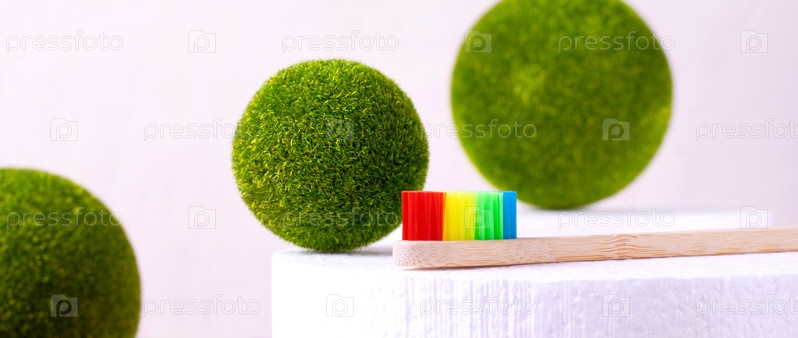 Деревянная зубная щетка с радужной щетиной и сферами зеленой травы на белом подиуме. Гигиенический инструмент из биоразлагаемых экологически чистых материалов