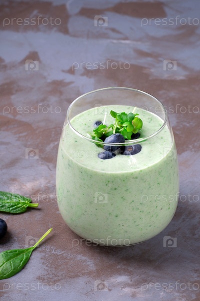 Зеленый фруктовый смузи со шпинатом, черникой и микрозеленью подается в стакане на сером столе. Здоровое питание