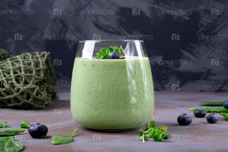 Зеленый фруктовый смузи со шпинатом, черникой и микрозеленью подается в стакане на сером столе. Здоровое питание