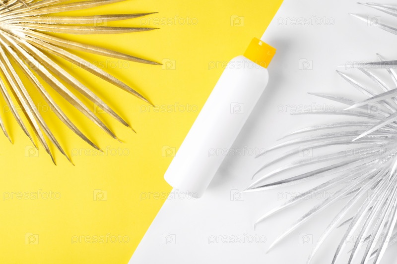 Средство по уходу за телом на желтом и белом фоне с золотыми и серебряными пальмовыми листьями. Немаркированная бутылка солнцезащитного крема или геля для душа. Макет красоты с копией пространства. Плоская планировка
