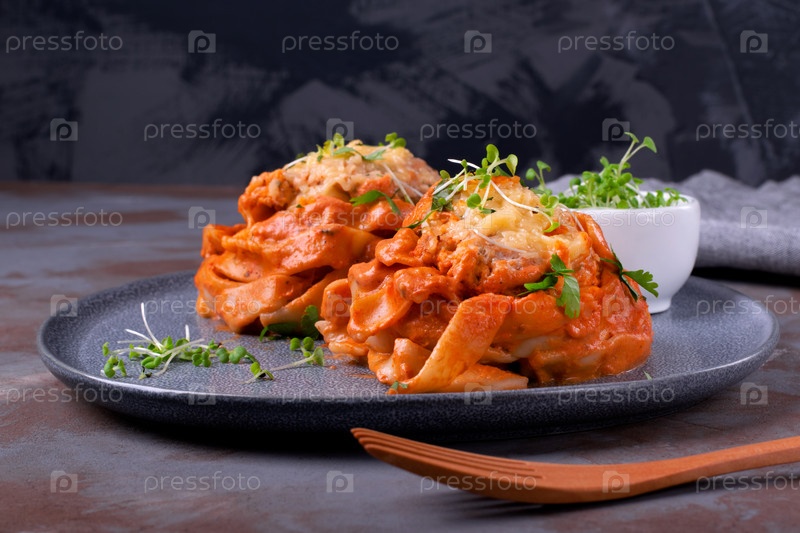 Гнезда фетучини с фрикадельками, сыром и томатным соусом подаются с микрозеленью на серой керамической тарелке. Горячая паста