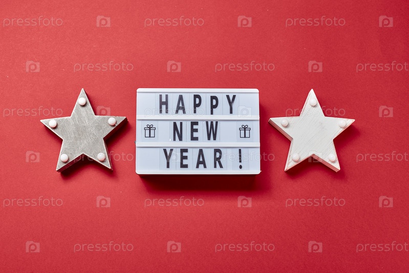 Новогодняя или рождественская композиция, плоская планировка, вид сверху. Световая коробка с надписью "С Новым годом" и деревянными украшениями из звезд на красном