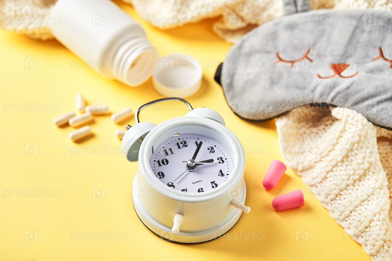 Маска для сна, будильник, затычки для ушей и таблетки на желтом. Креативная концепция здорового ночного сна
