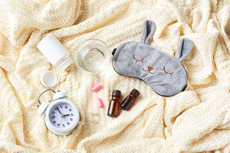 Маска для сна, будильник, затычки для ушей и таблетки. Креативная концепция здорового ночного сна