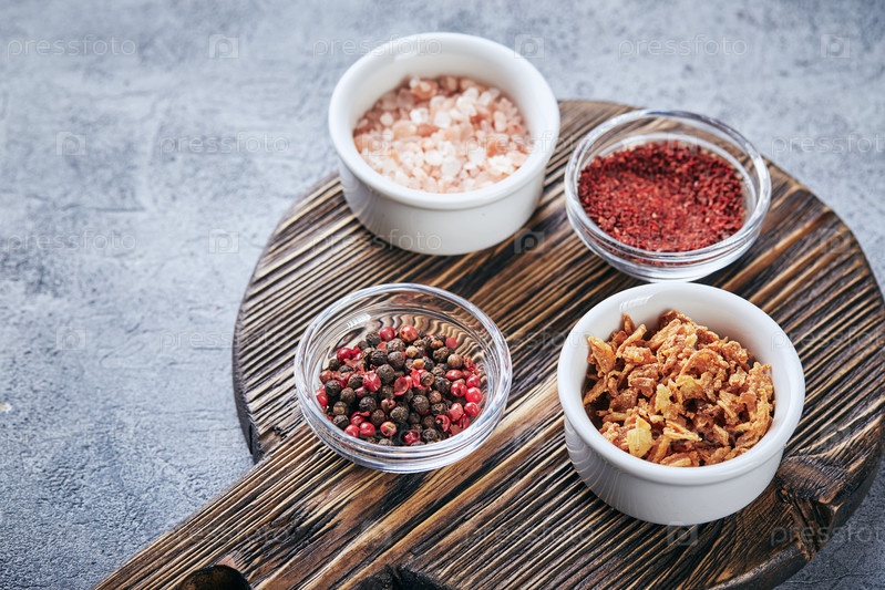 Смесь красного и черного перца горошком, крупной гималайской розовой соли, вяленых помидоров и сушеного лука