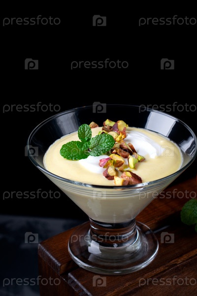 Десерт манго с йогуртом с фисташками и мятой в стеклянной миске на черном фоне. Изысканный десерт