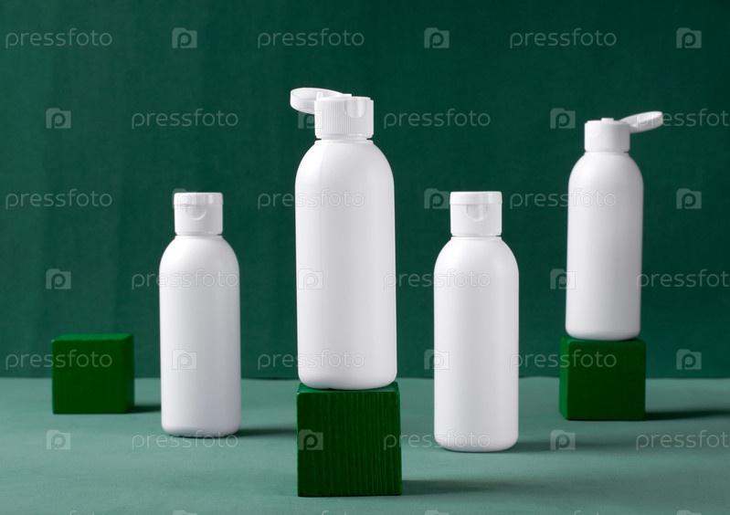 Четыре белые косметические бутылки на зеленом фоне с кубическими подиумами. Уход за телом, уход за кожей или аптечный продукт. Набор дорожных контейнеров для косметики