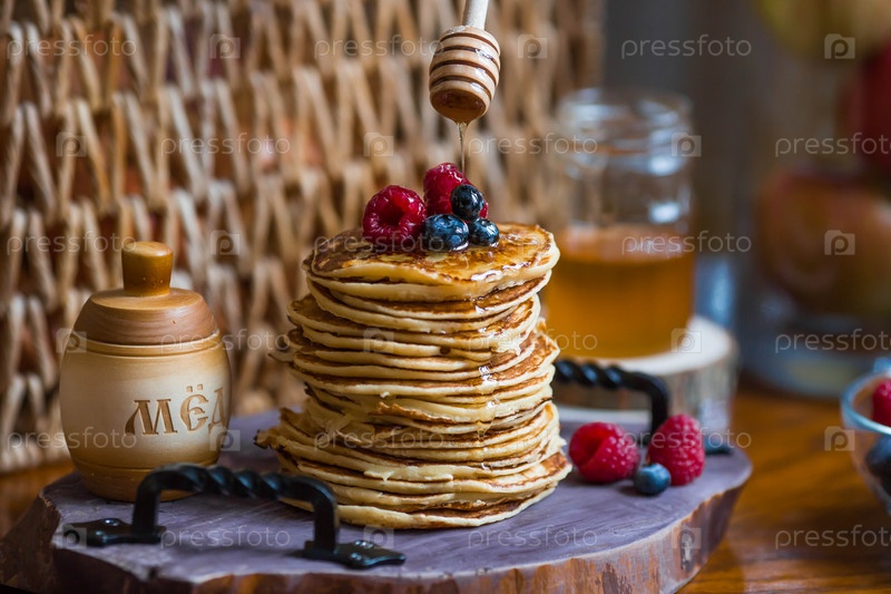 Вкусные блины с медом, черникой и малиной. Рядом с ним деревянная бочка с надписью на русском языке: «мед». Концепция праздника Масленица