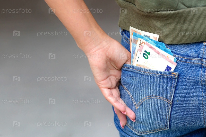 Задний карман джинсов крупным планом. Банкнота в 50 евро торчит из кармана. Концепция бизнеса, финансов и вознаграждения