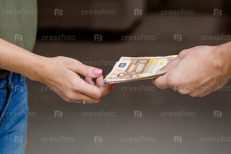 Женские руки и мужские руки крупным планом. Мужчина держит и дает банкноты евро женщине. Концепция бизнеса, финансов и вознаграждения