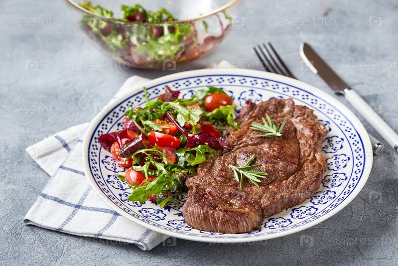 Стейки на гриле и овощной салат на светлом фоне. Сервировка стола, концепция питания