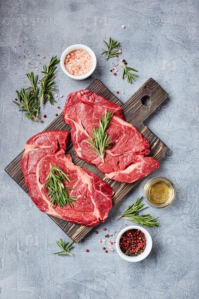 Два свежих сырого мяса Prime Black Angus Beef Steaks, Rib Eye, Денвер, на деревянной разделочной доске