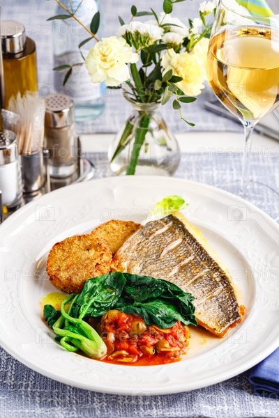 Филе судака с овощными котлетами и овощами в ресторанной обстановке