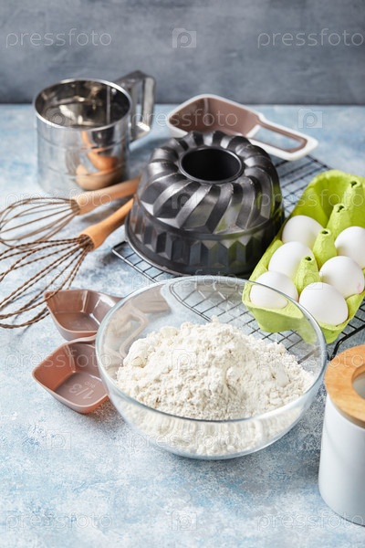 Ингредиенты для выпечки и посуда, мука, яйца, форма для выпечки на светлом фоне