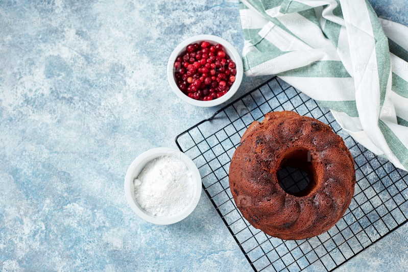 Шоколадный пирог на металлической решетке, сахарная пудра и клюква в мисках, приготовленные для украшения