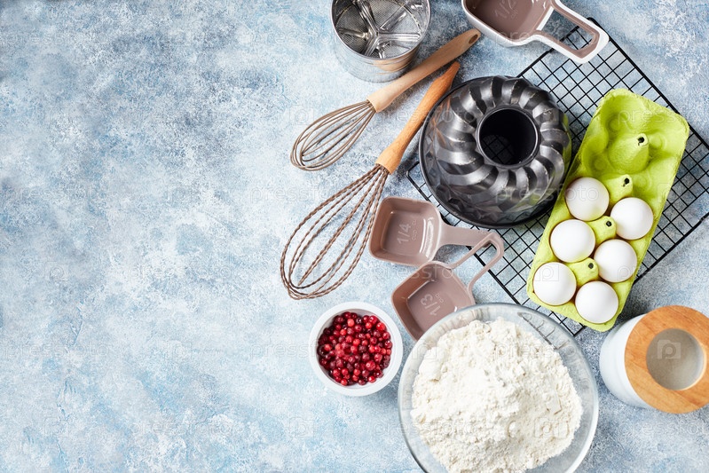 Ингредиенты для выпечки и посуда, мука, яйца, форма для выпечки на светлом фоне