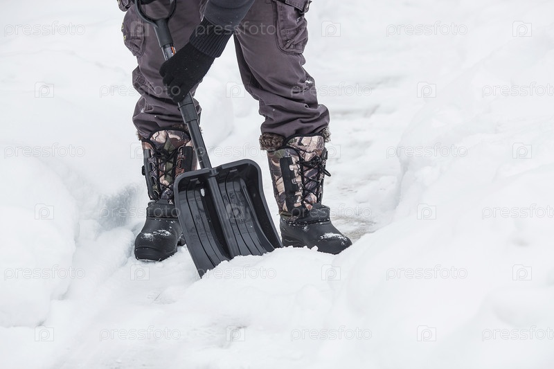 Очистка от снега. Ноги и лопата крупным планом. Уборка улиц