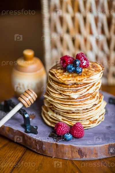 Вкусные блины с медом, черникой и малиной. Рядом с ним деревянная бочка с надписью на русском языке: «мед». Концепция праздника Масленица