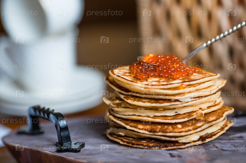 Вкусные блинчики с красной икрой. Русская и украинская кухня. Концепция русского праздника Масленица