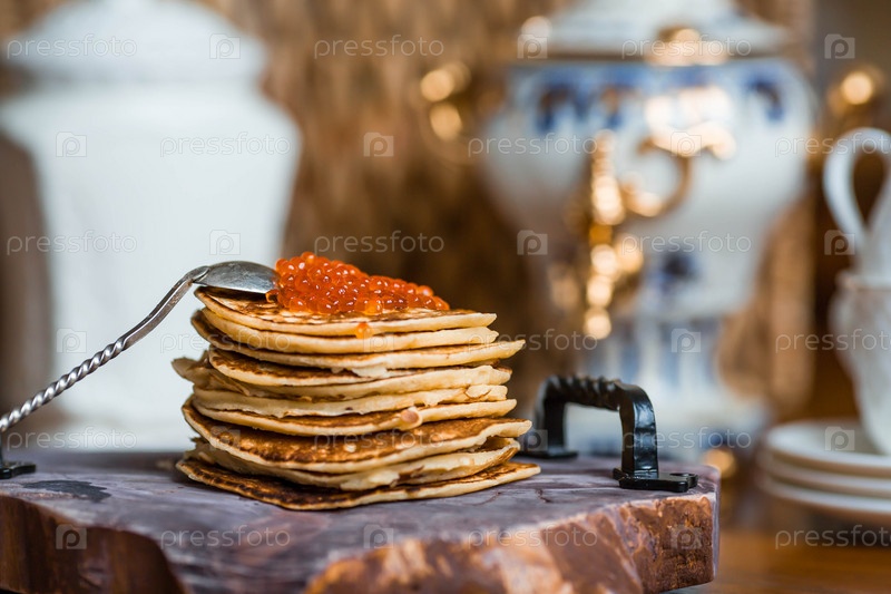 Вкусные блинчики с красной икрой. Русская и украинская кухня. Концепция русского праздника Масленица
