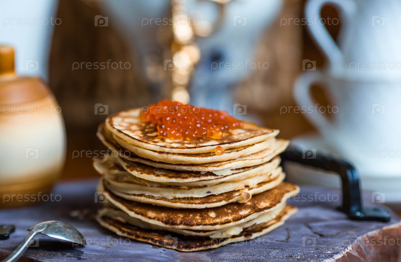 Вкусные блинчики с красной икрой. Русская и украинская кухня. Концепция русского праздника Масленица
