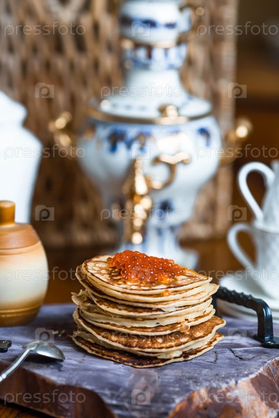 Вкусные блинчики с красной икрой. Русская и украинская кухня. Концепция русского праздника Масленица
