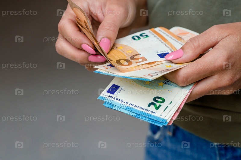 Женские руки крупным планом. Женщина держит банкноты евро и кошелек для денег. Концепция бизнеса, финансов и вознаграждения