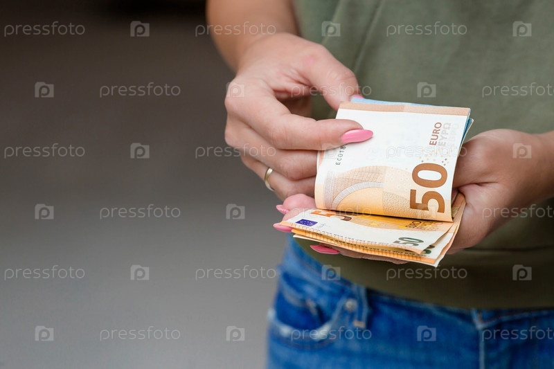 Женские руки крупным планом. Женщина держит в руках банкноты евро и считает их. Концепция бизнеса, финансов и вознаграждения