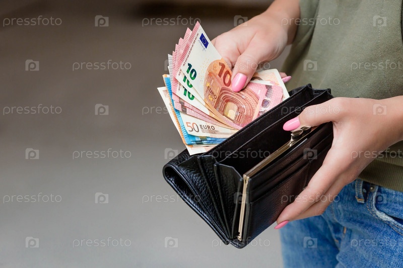 Женские руки крупным планом. Женщина держит банкноты евро и кошелек для денег. Концепция бизнеса, финансов и вознаграждения