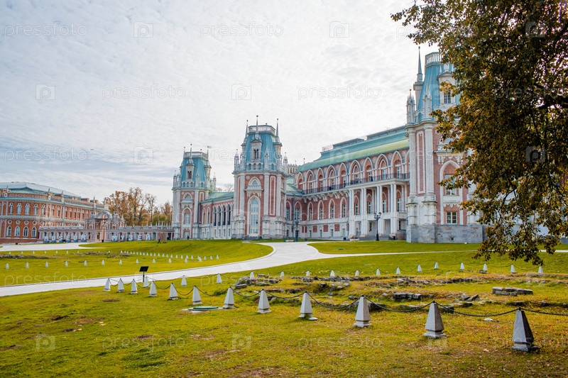 Россия. Большой дворец в Царицынском парке. Царицынский парк — одна из главных туристических достопримечательностей Москвы. Красивый живописный вид на старый вход комплекса осенью в ясный день