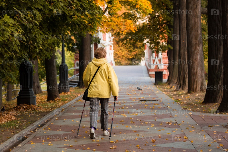 Женщина в парке занимается скандинавской ходьбой осенью. Концепция здоровья, красоты и молодости