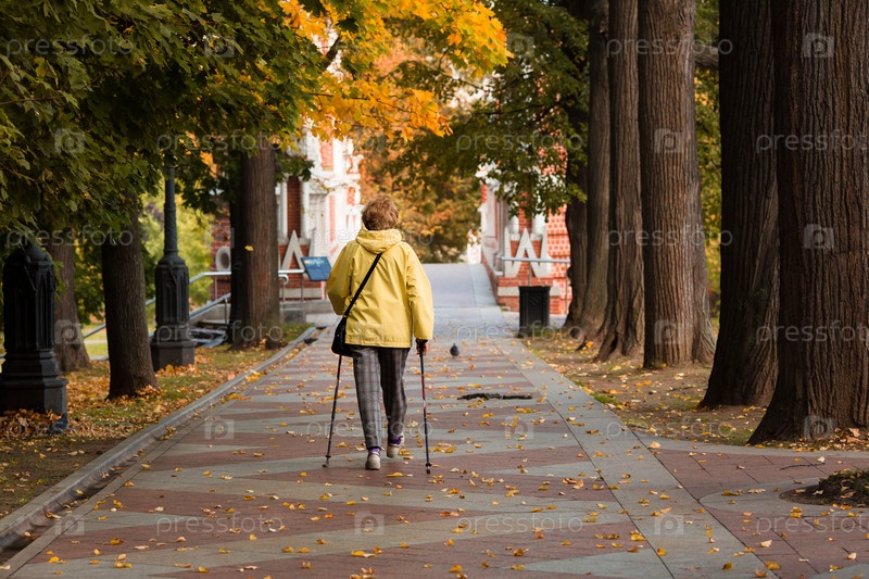 Женщина в парке занимается скандинавской ходьбой осенью. Концепция здоровья, красоты и молодости