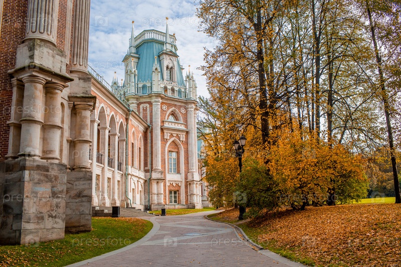 Россия. Большой дворец в Царицынском парке. Царицынский парк — одна из главных туристических достопримечательностей Москвы. Красивый живописный вид на старый вход комплекса осенью в ясный день