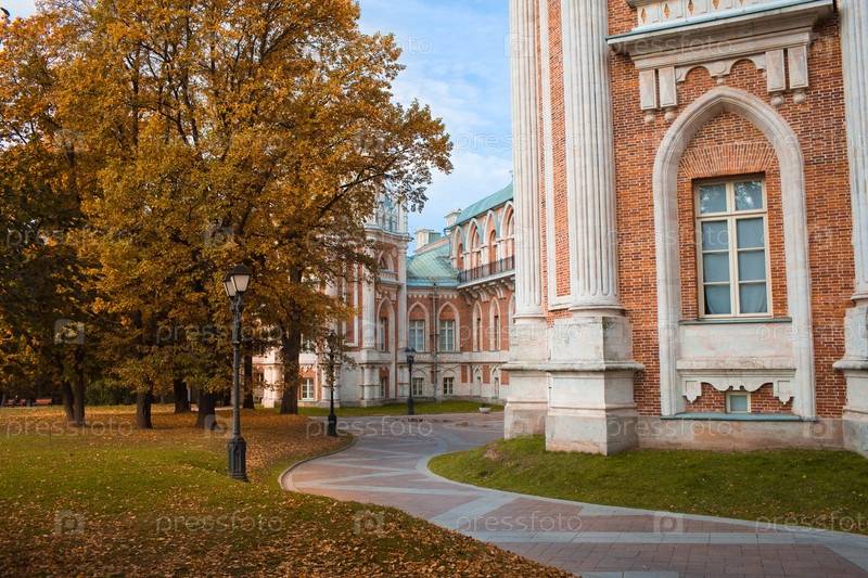 Россия. Большой дворец в Царицынском парке. Царицынский парк — одна из главных туристических достопримечательностей Москвы. Красивый живописный вид на старый вход комплекса осенью в ясный день