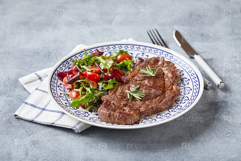 Стейки на гриле и овощной салат на светлом фоне. Сервировка стола, концепция питания