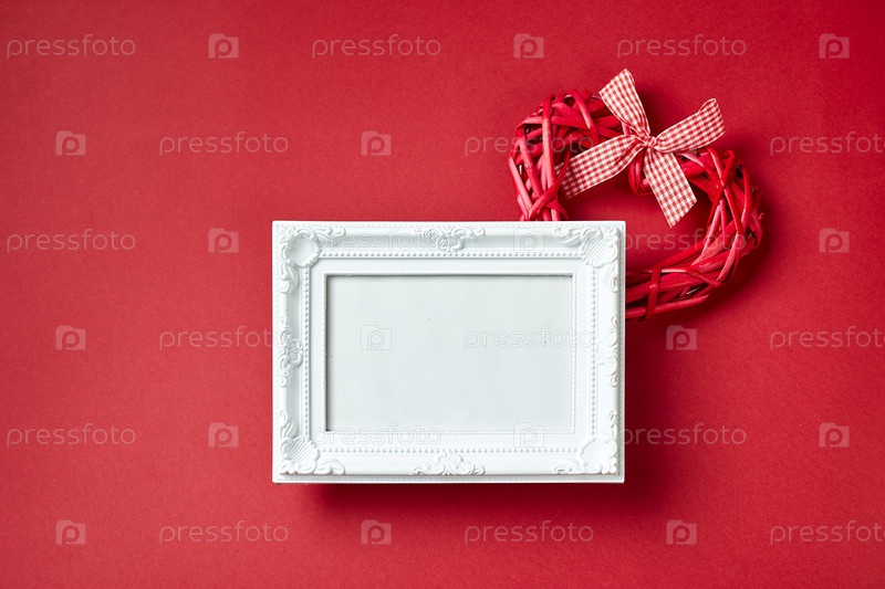 Фоторамка и сердца и украшения Дня святого Валентина на красном фоне