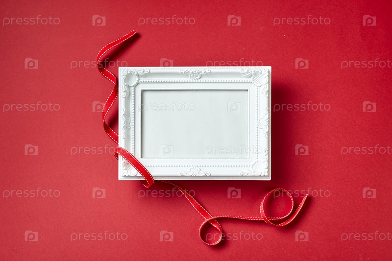 Фоторамка и сердца и украшения Дня святого Валентина на красном фоне