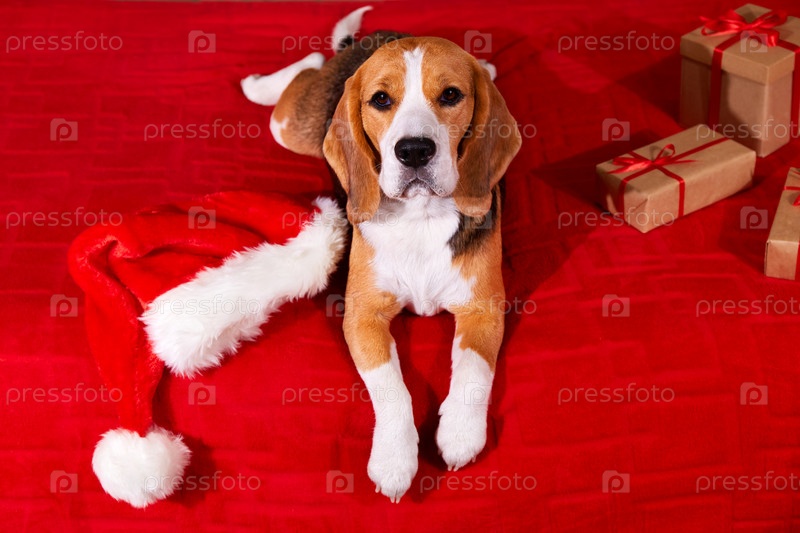 Собака бигль ждет праздник дома с подарками